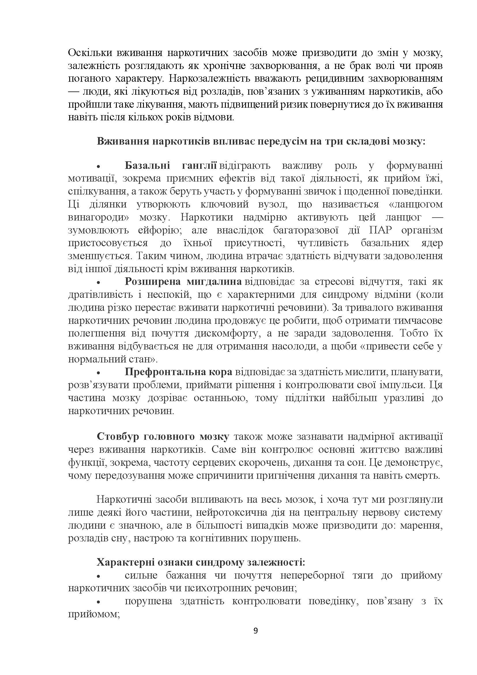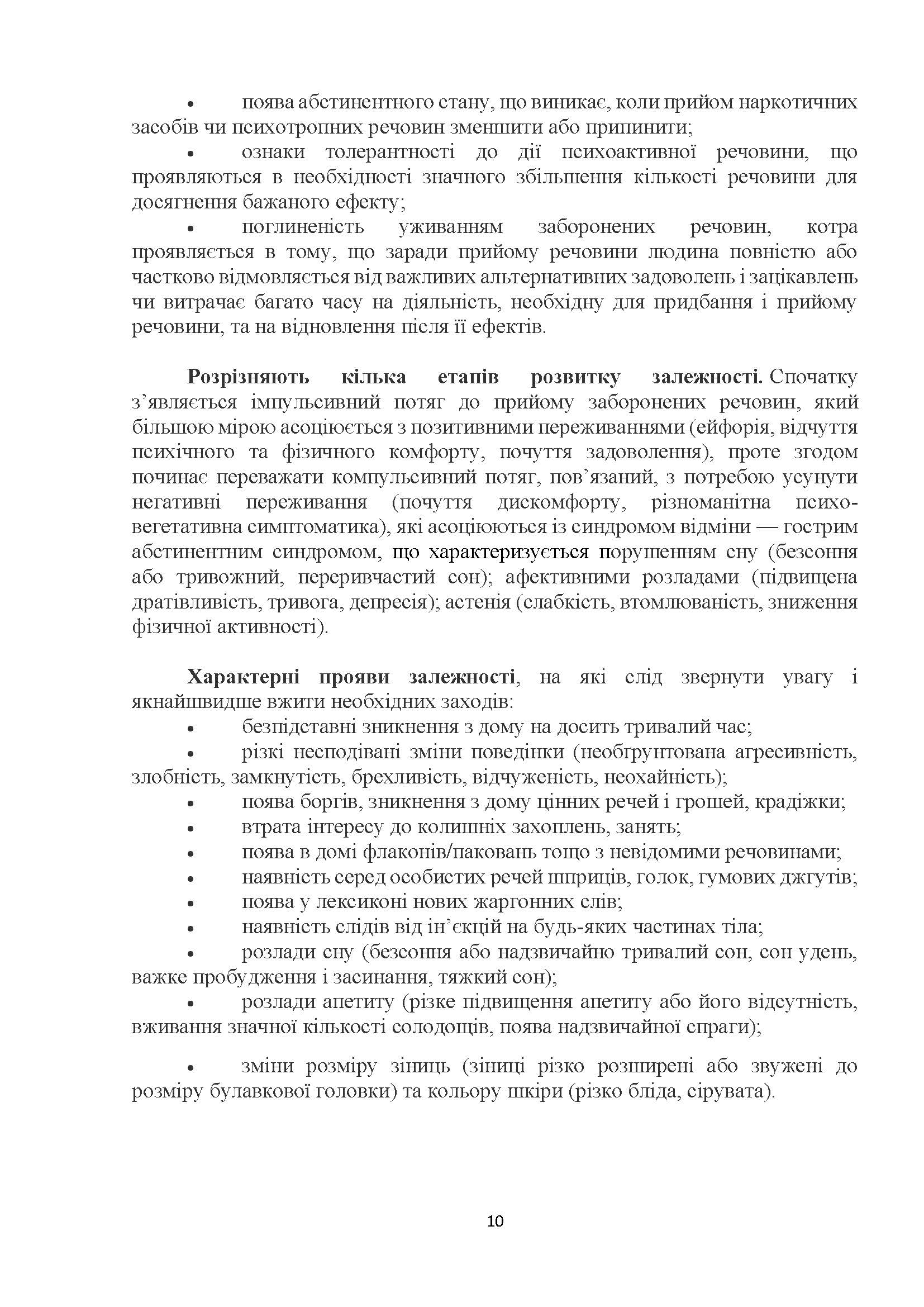 психічна залежність; 2. фізична залежність з можливим абстинентним синдромом (синдромом відміни). Щоб позбутися проявів абстиненції (фізичних страждань), наркозалежний починає приймати щоразу більші дози наркотику; 3. зростання витривалості (толерантності) – наркозалежні зі стажем також збільшують дози наркотику, у порівнянні з початковим етапом.
